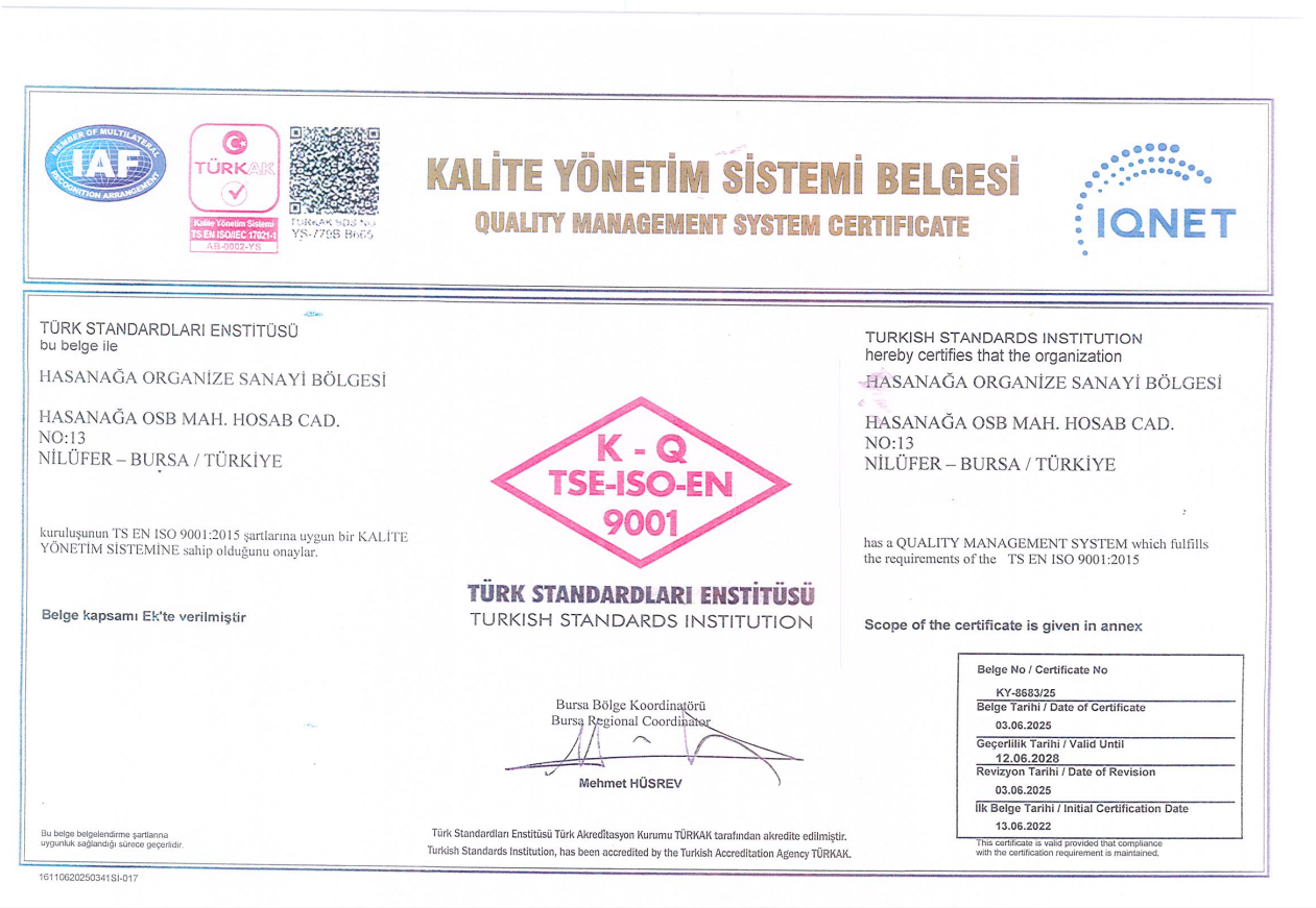 “Kalite yönetimi sistemi kapsamı Mevzuat esasları çerçevesinde, Hasanağa OSB sınırları içerisindeki katılımcı firmalara İmar, Altyapı ve Çevre Yönetim hizmetlerinin sunulması olarak belirlenmiştir.”